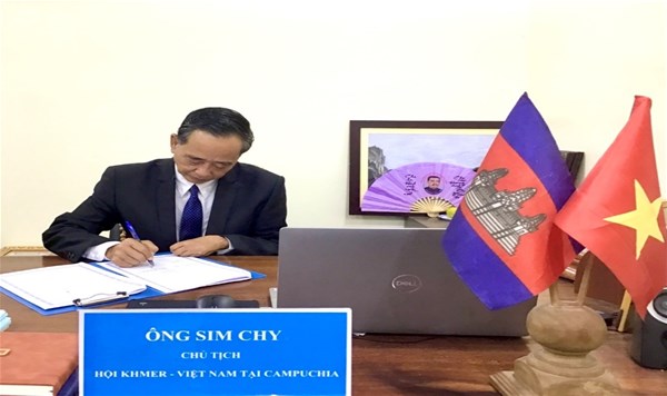 Ông Sim Chy Chủ tịch - Hội Khmer – Việt Nam tại Campuchia thực hiện ký kết hợp tác tại điểm cầu Campuchia