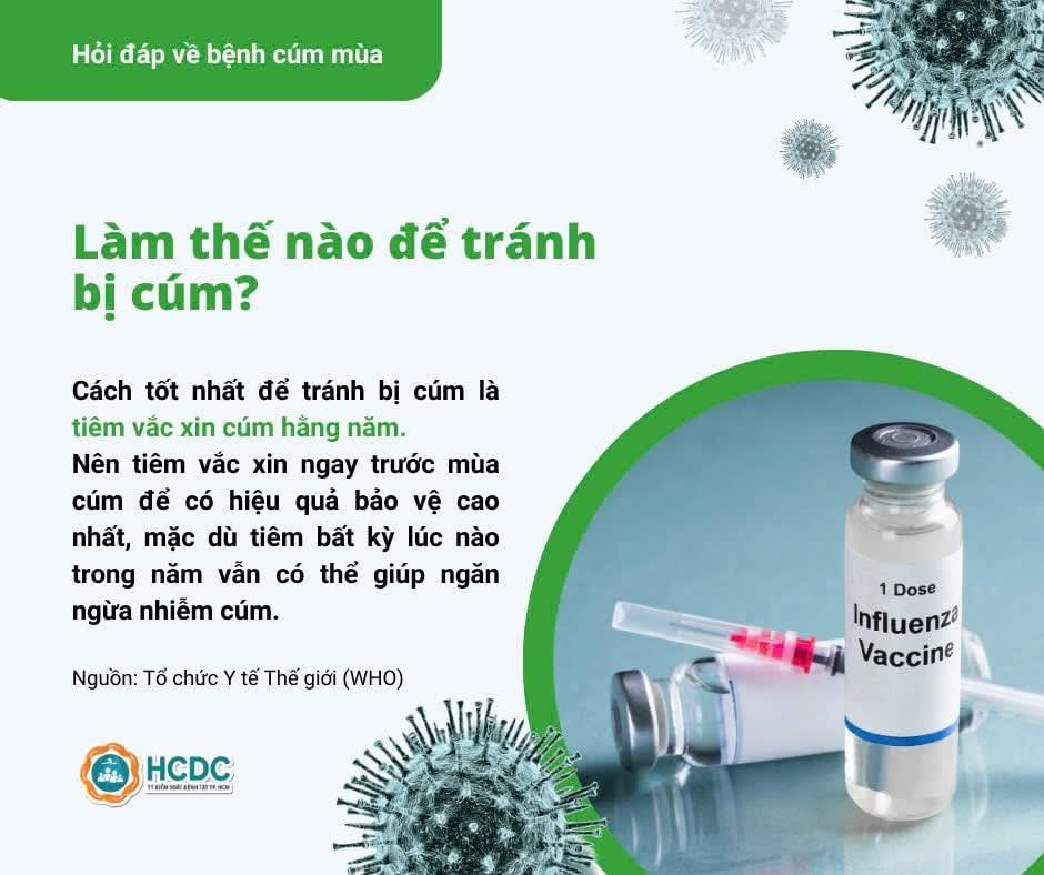 Cách tốt nhất để tránh bị cúm là tiêm vắc xin cúm hằng năm. Nên tiêm vắc xin ngay trước mùa cúm để có hiệu quả bảo vệ cao nhất, mặc dù tiêm bất kỳ lúc nào trong năm vẫn có thể giúp ngăn ngừa nhiễm cúm.