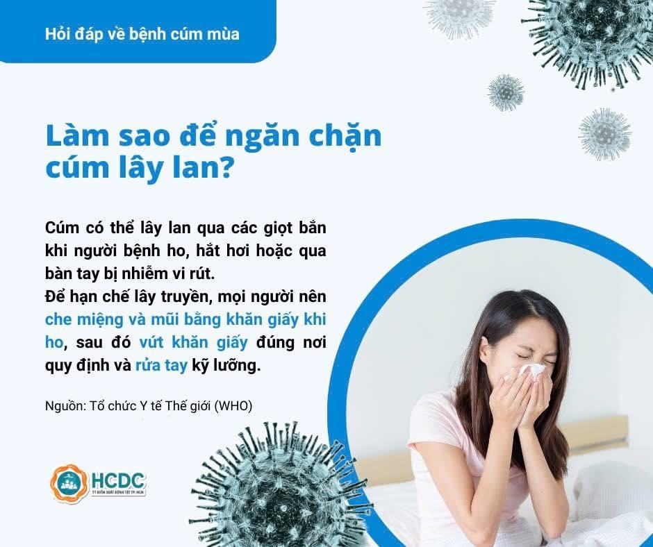 Cúm có thể lây lan qua các giọt bắn khi người bệnh ho, hắt hơi hoặc qua bàn tay bị nhiễm vi rút. Để hạn chế lây truyền, mọi người nên che miệng và mũi bằng khăn giấy khi ho, sau đó vứt khăn giấy đúng nơi quy định và rửa tay kỹ lưỡng.