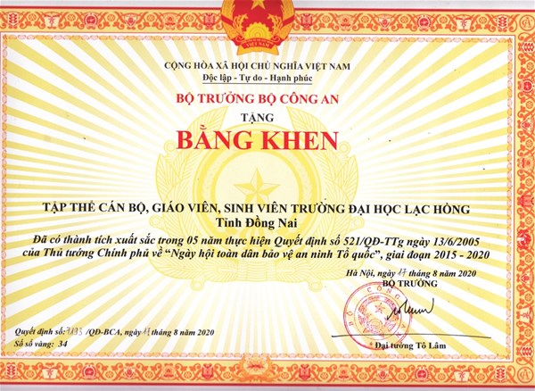 Sáng ngày 08/01/2021, Trường Đại học Lạc Hồng đã vinh dự đón nhận tặng bằng khen của Bộ Công an vì đã có thành tích xuất sắc trong 05 năm thực hiện Quyết định số 521/QĐ-TTg ngày 13/6/2005 của Thủ tướng Chính phủ về “Ngày hội toàn dân bảo vệ an ninh Tổ quốc”, giai đoạn 2015-2020.