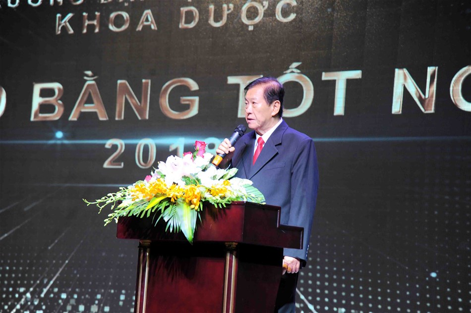 NGND.TS Đỗ Hữu Tài phát biểu tổng kết 5 năm khoa Dược và trao hoa chúc mừng Ban Lãnh đạo Khoa Dược