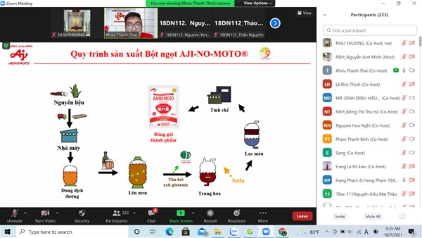 Tại buổi tham quan online, thầy và trò ngành Nhật Bản học được lắng nghe Đại diện phía Công ty Ajinomoto giới thiệu về lịch sử hình thành và quá trình phát triển của công ty, chia sẻ nhiều kiến thức về mô hình hoạt động sản xuất.